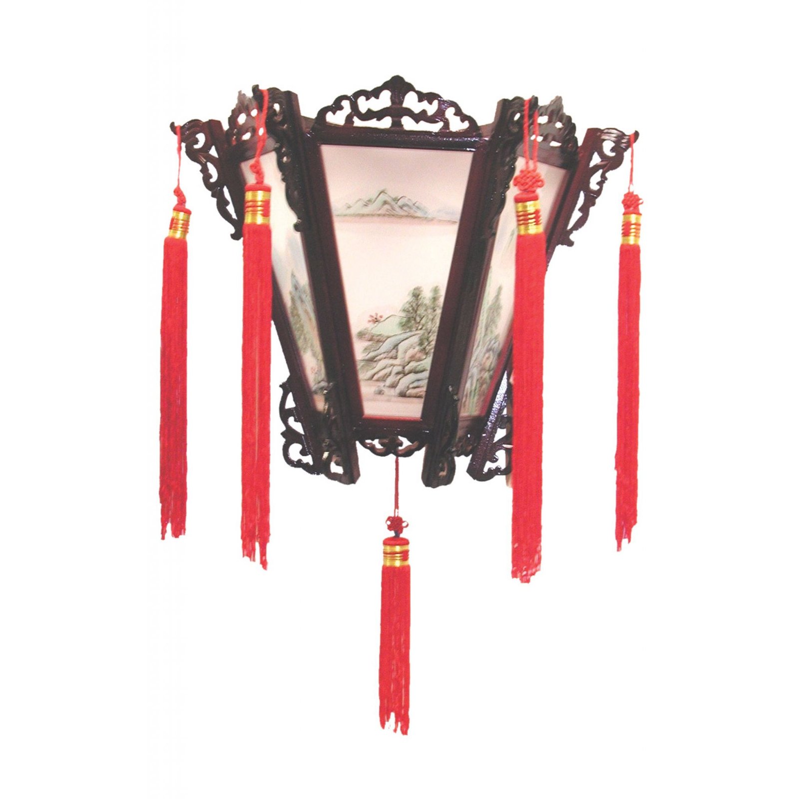 Palace Lantern for wall mounting with wood framework and fretwork carving around three glass panels featuring hand-painted landscape artwork. Complete with long red tassels for display and useless assembly instruction sheet. There is no provision for installing lighting within the lantern and no rating